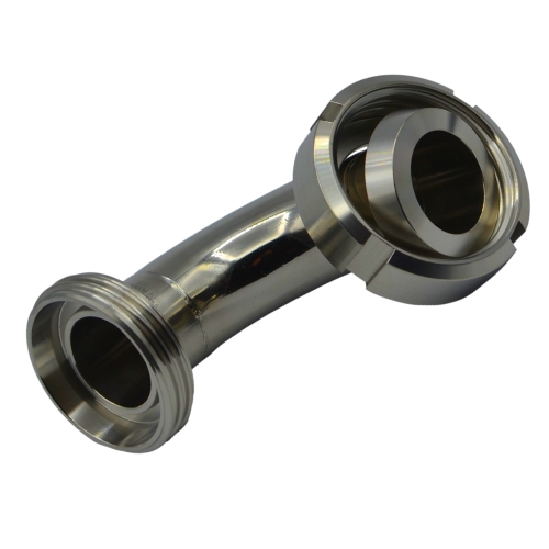 Raccordo di collegamento a 90 gradi con attacco maschio DN32 con girella da un lato e attacco DN32 femmina dall’altro.