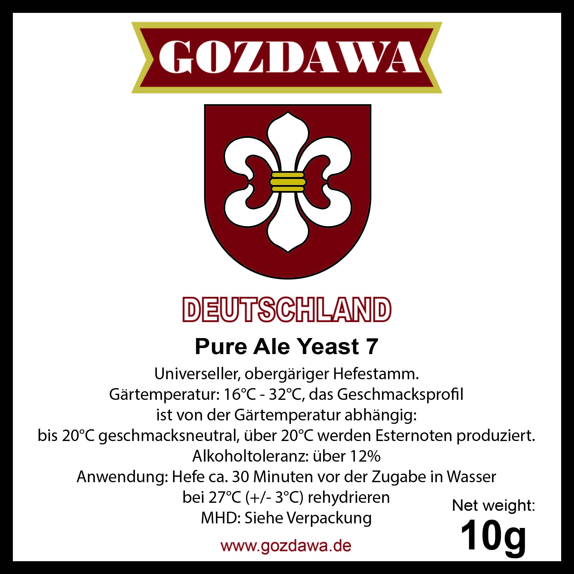 Il lievito per birra Gozdawa Pure Ale 7 è un ceppo universale e ben bilanciato, neutro se fatto lavorare sotto ai 20°C, enfatizza la presenza di esteri se fatto lavorare a temperature più alte. Buona attenuazione ed ottima flocculazione. Indicato anche per la rifermentazione in bottiglia.